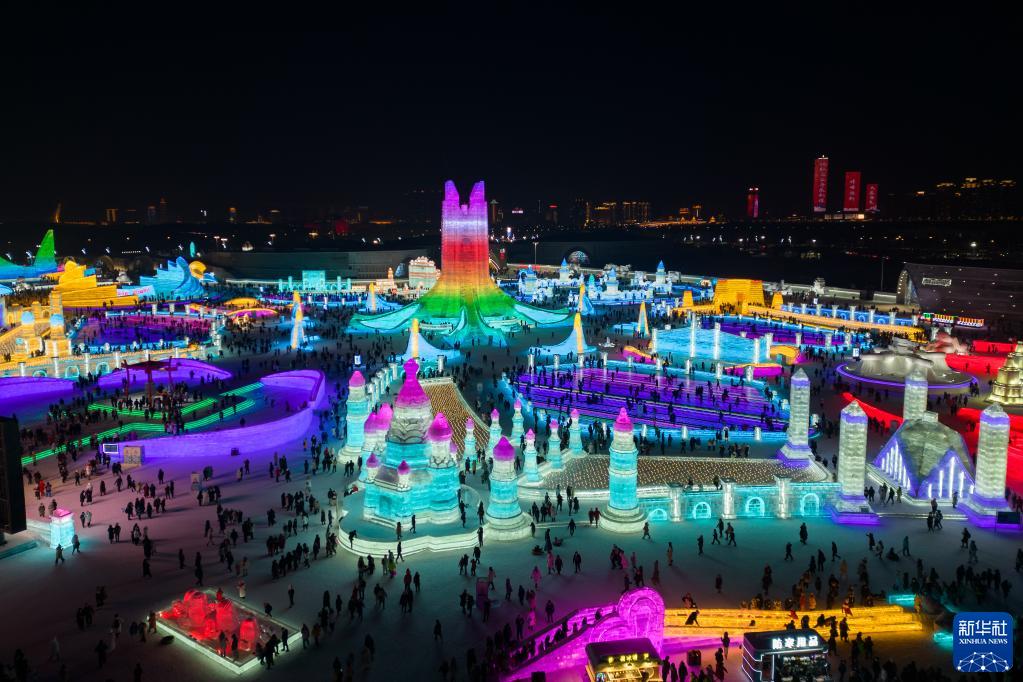 1月25日,游客在哈爾濱冰雪大世界園區(qū)內(nèi)游玩(無(wú)人機(jī)照片)。