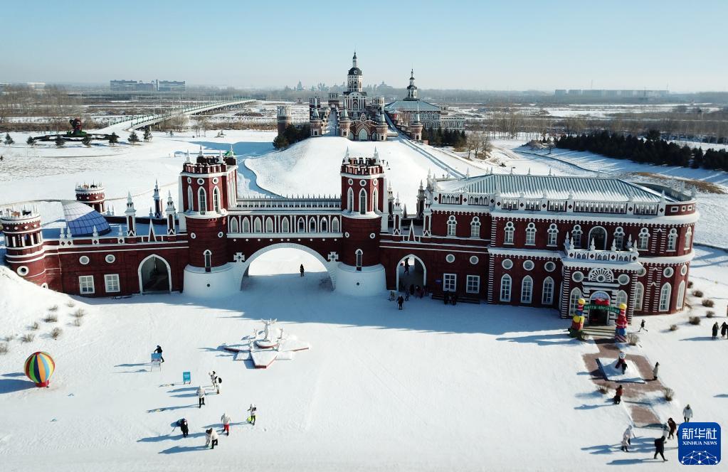 1月26日,游客在哈爾濱伏爾加莊園體驗冰雪娛樂項目(無人機照片)。
