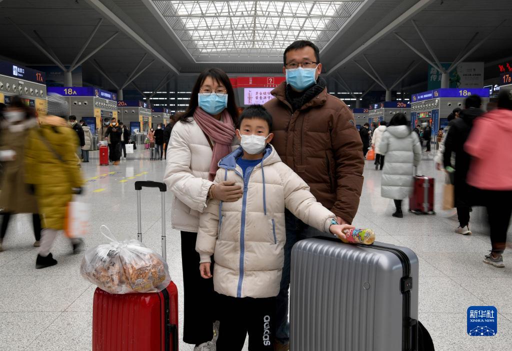 河南省信陽市浉河區(qū)董家河鄉(xiāng)高嶺村人劉紅善(右)和愛人傅雪梅、兒子劉宇辰在鄭州東站候車大廳內(nèi)候車,準備去往廣州(1月26日攝)。劉紅善在廣州已經(jīng)工作了6年,近3年都沒能回老家過春節(jié),今年專門回家陪老父親過節(jié)。