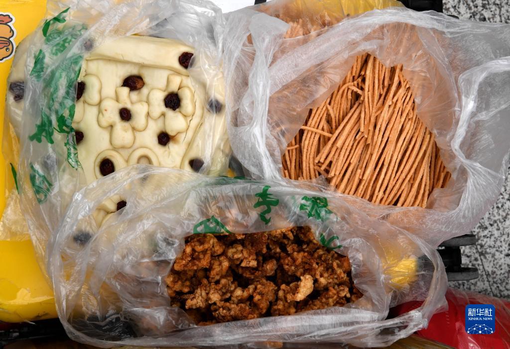 崔偉行囊里裝的母親親手制作的油炸酥肉、棗饃等他和兒子愛吃的食品(1月26日攝)。