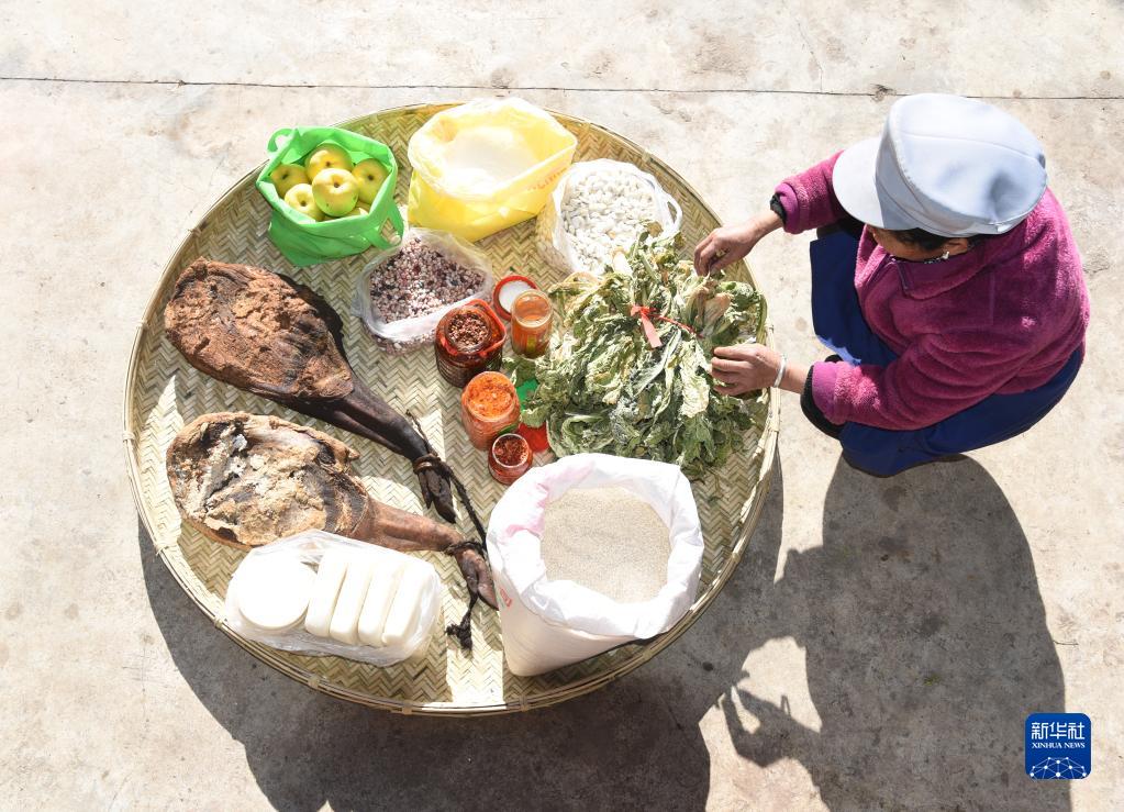 云南省大理白族自治州劍川縣馬登鎮文屏村人張茂盛即將裝進行囊里的物品(1月26日攝),有父母親手制作的火腿,當地特產餌塊和豬肝胙、豆豉和白蕓豆等。