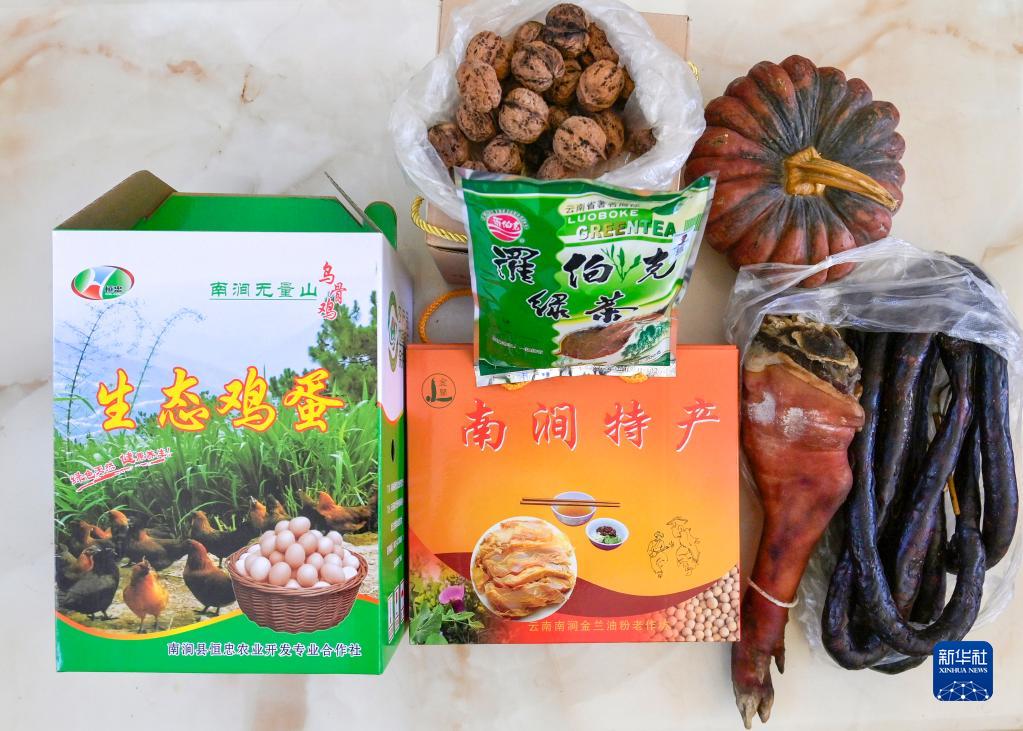 云南省大理白族自治州南澗彝族自治縣小灣東鎮紙房村人蘭云婭即將裝進行囊里的物品(1月26日攝),有父母親手腌制的臘肉香腸、南澗土特產生態土雞蛋、南澗鍋巴油粉和茶葉等。
