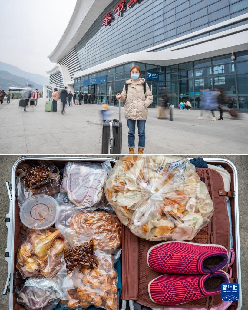 拼版照片:上圖為重慶市巫溪縣花臺鄉(xiāng)花臺村人劉明興在奉節(jié)站候車,準(zhǔn)備去往重慶主城上班(1月26日攝)。劉明興在重慶主城已工作了8年,因為各種原因已經(jīng)兩年沒能回老家過春節(jié),今年專門回家陪家人一起過節(jié)。下圖為劉明興行囊里裝的物品(1月26日攝)。除了自己帶的衣物外,劉明興行囊里裝滿了家人給準(zhǔn)備的土雞、臘肉、自制的牛肉干和母親為她親手鉤織的棉鞋等物品。
