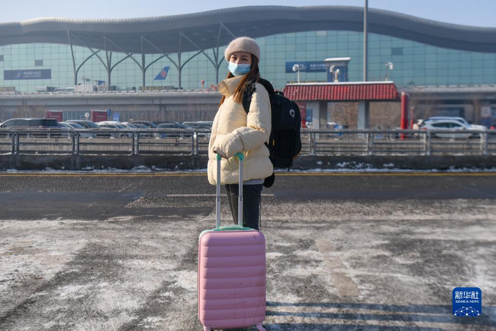 新疆女孩戴詩蕊在新疆烏魯木齊地窩堡國際機(jī)場T3航站樓前,準(zhǔn)備乘飛機(jī)前往北京(1月26日攝)。大學(xué)畢業(yè)后就留在北京工作的她每年過年都會回到烏魯木齊和家人團(tuán)聚。