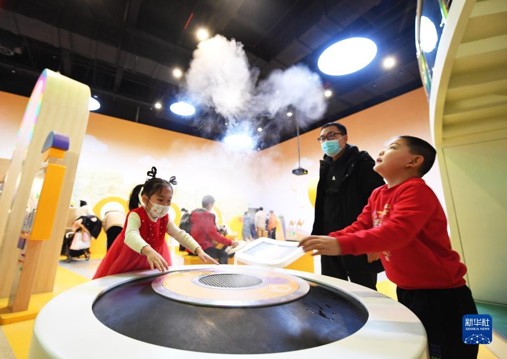 1月27日,小朋友在河南省科技館新館“童夢樂園”展廳體驗科技項目。