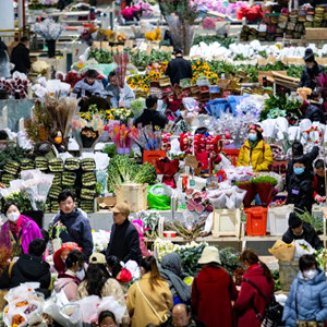當日是大年初六,位于云南省昆明市的斗南花市內人頭攢動,人們逛花市、買鮮花,歡度假期。