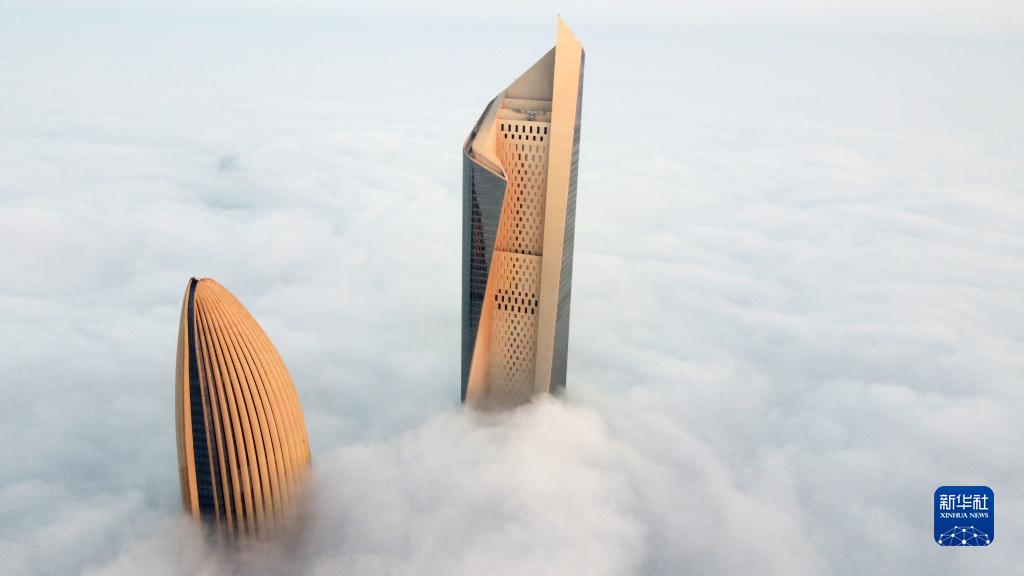1月21日,在科威特首都科威特城,高層建筑露出籠罩在城市上空的云霧間(無人機照片)。