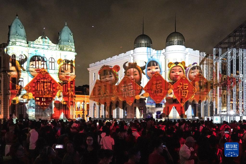 1月19日,人們在巴西累西腓市舉行的中國春節慶祝活動上欣賞燈光秀。