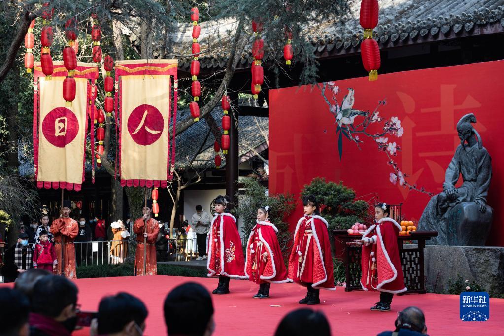 1月28日,在四川成都舉行的“人日”游草堂、祭拜詩圣杜甫活動(dòng)現(xiàn)場(chǎng),草堂小學(xué)的學(xué)生代表誦讀杜甫詩。