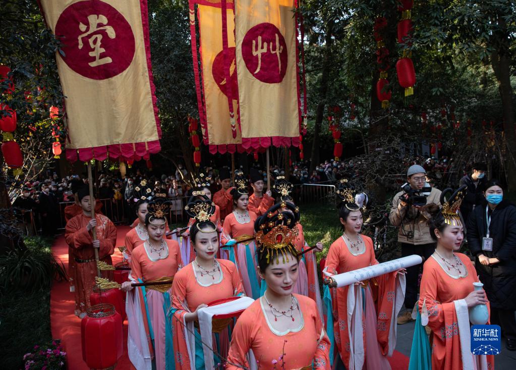 當(dāng)日是農(nóng)歷正月初七,又稱“人日”,一年一度的“人日”游草堂、祭拜詩(shī)圣杜甫活動(dòng)在成都杜甫草堂舉行。社會(huì)各界群眾齊聚草堂大雅堂前,舉行祭拜儀式和詩(shī)會(huì),祭拜先賢,緬懷詩(shī)圣,弘揚(yáng)中華優(yōu)秀傳統(tǒng)文化。