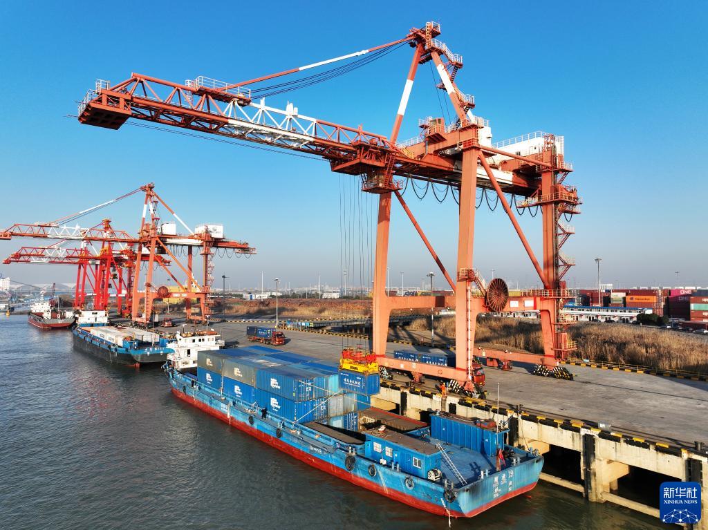 1月28日,貨輪在江蘇省揚州港集裝箱碼頭進(jìn)行集裝箱裝卸作業(yè)(無人機照片)。