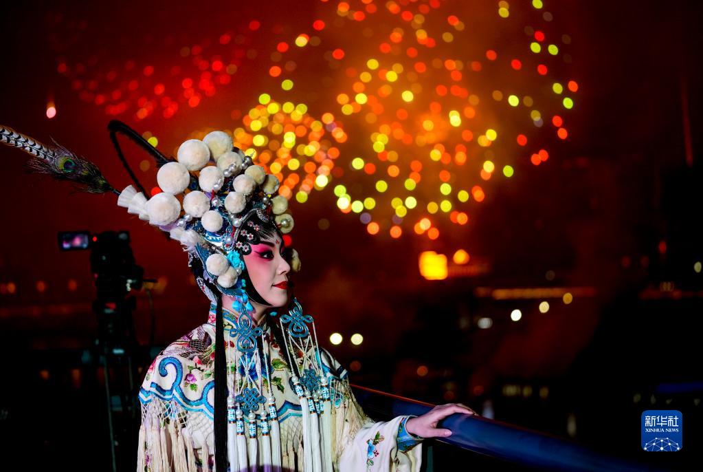 1月22日凌晨,一名川劇演員在演出結束后觀賞焰火表演。1月21日除夕夜,一場光影無人機焰火表演在重慶長江、嘉陵江兩江交匯處舉行。