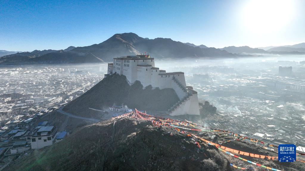 1月24日拍攝的日喀則市的清晨(無人機照片)。西藏日喀則地方藏歷農家新年期間,藏族群眾沿襲傳統,一大早就在山頂和自家屋頂上豎起新經幡,祈愿新年風調雨順、國泰民安。