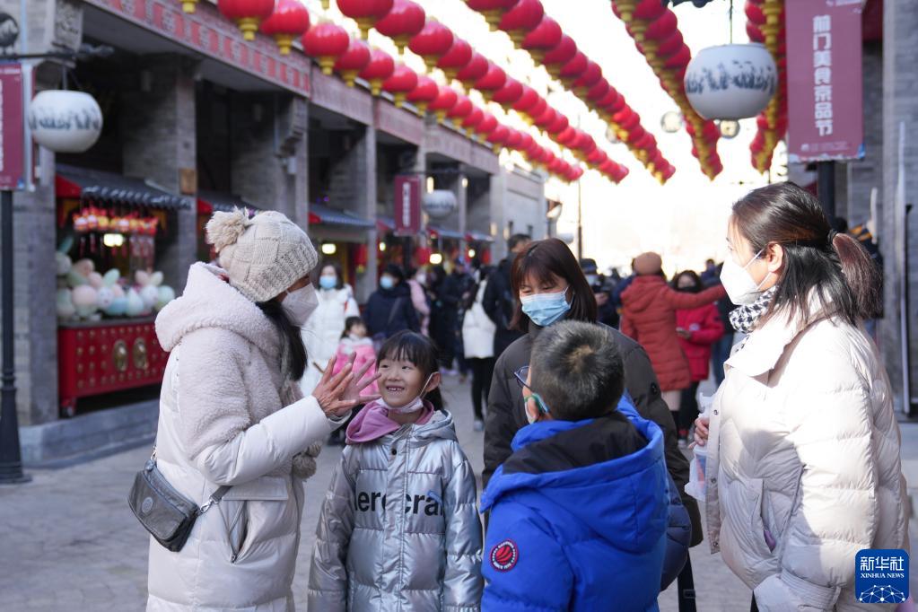 1月28日,在北京市東城區鮮魚口街,導游何靜(左一)在為游客講解。