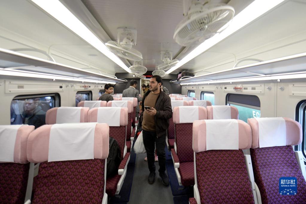 1月27日,乘客在巴基斯坦伊斯蘭堡登上綠線特快列車組的中國進(jìn)口鐵路客車。