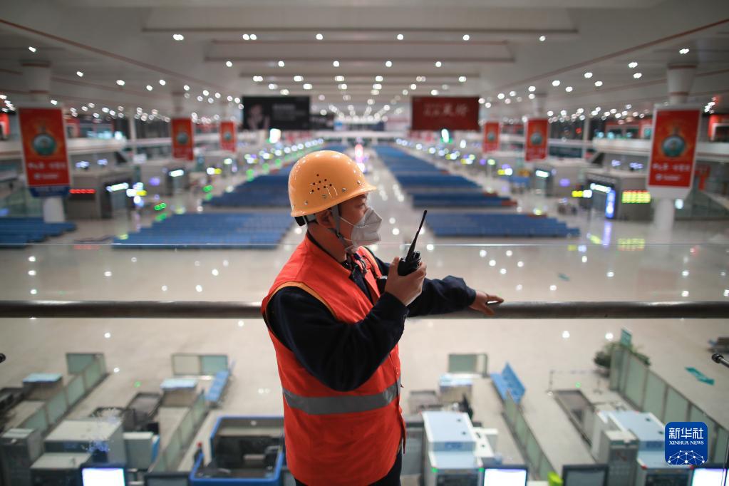 1月29日,一名工作人員在空無一人的貴陽北站候車大廳內通過對講機和同事溝通。