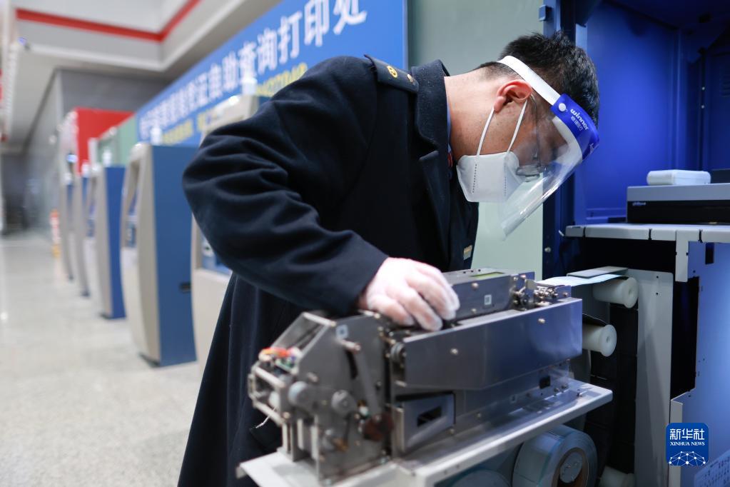 1月29日,設(shè)備檢修人員在貴陽(yáng)北站維護(hù)電子客票報(bào)銷憑證打印設(shè)備。
