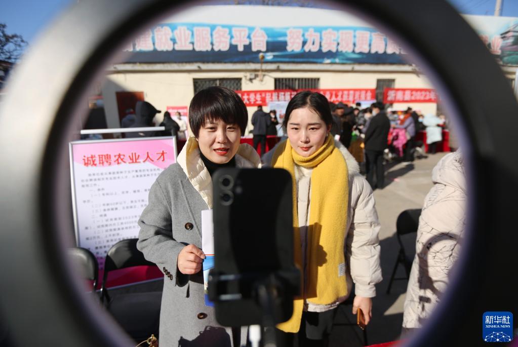 1月29日,在山東省臨沂市沂南縣舉行的2023年“春風行動”暨“就業援助月”現場招聘會上,一家用人企業通過線上、線下相結合的方式介紹招聘崗位信息。
