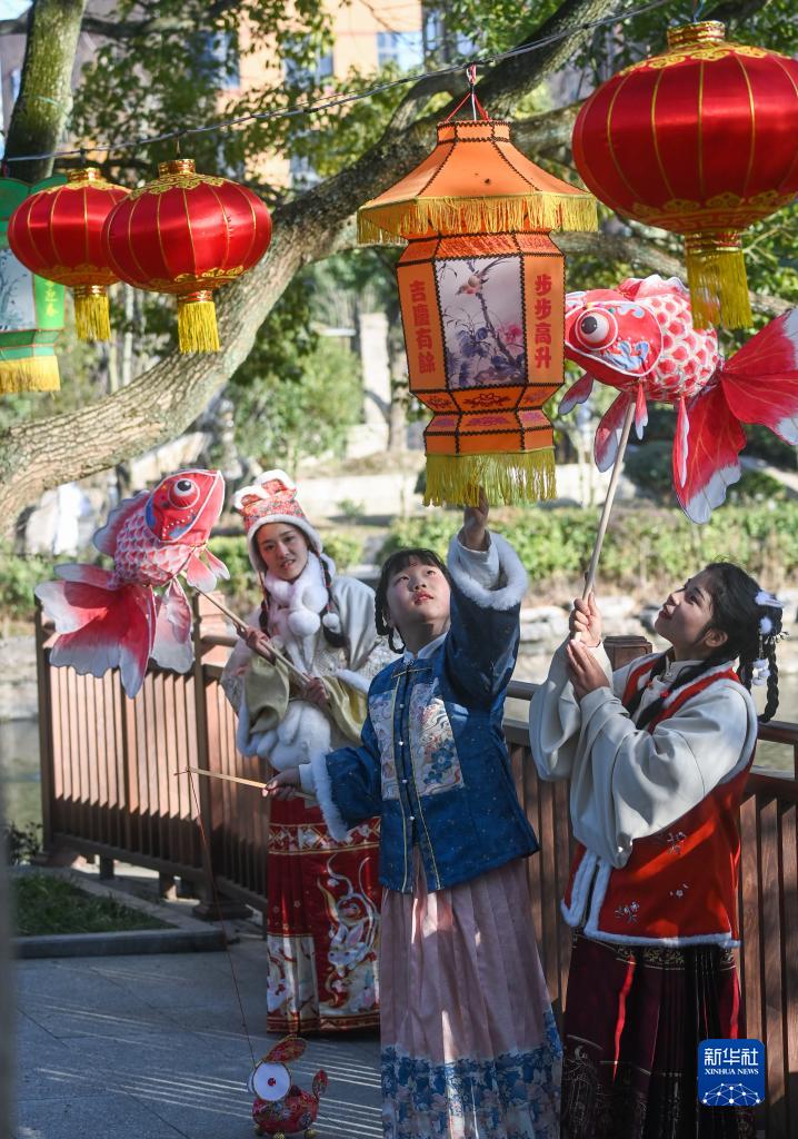 1月29日,在嘉興市秀洲區新塍古鎮小蓬萊公園內,身著傳統服飾的游客在“鰲山燈會”現場觀賞花燈。