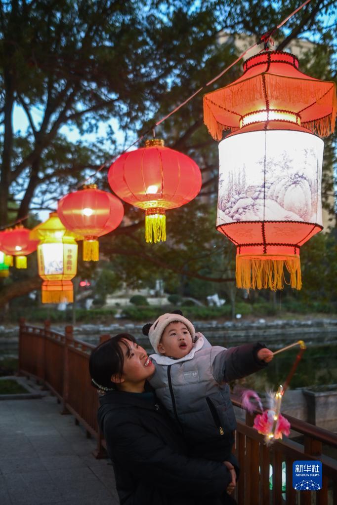 1月29日,在嘉興市秀洲區(qū)新塍古鎮(zhèn)小蓬萊公園內(nèi),一位家長帶著孩子在觀賞“鰲山燈會(huì)”的彩燈。
