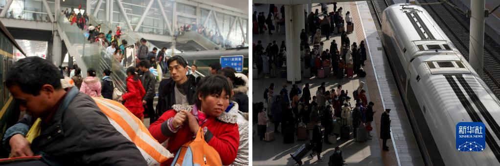 拼版照片:左圖為2009年1月30日,旅客在阜陽火車站乘車;右圖為2023年1月27日,旅客在阜陽西站乘車。