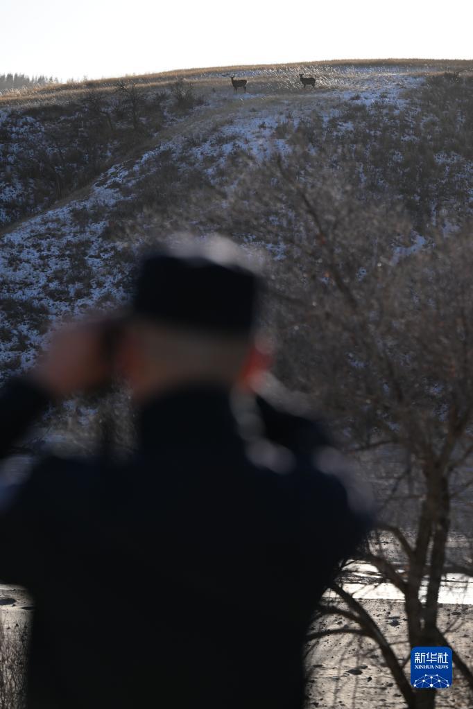 1月29日,多倫縣森林公安局灤河源國家森林公園森林公安派出所的民警在森林公園內(nèi)察看遠(yuǎn)處馬鹿。