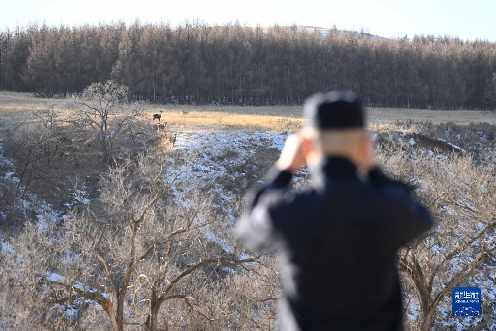 1月29日,多倫縣森林公安局灤河源國家森林公園森林公安派出所的民警在森林公園察看馬鹿情況。