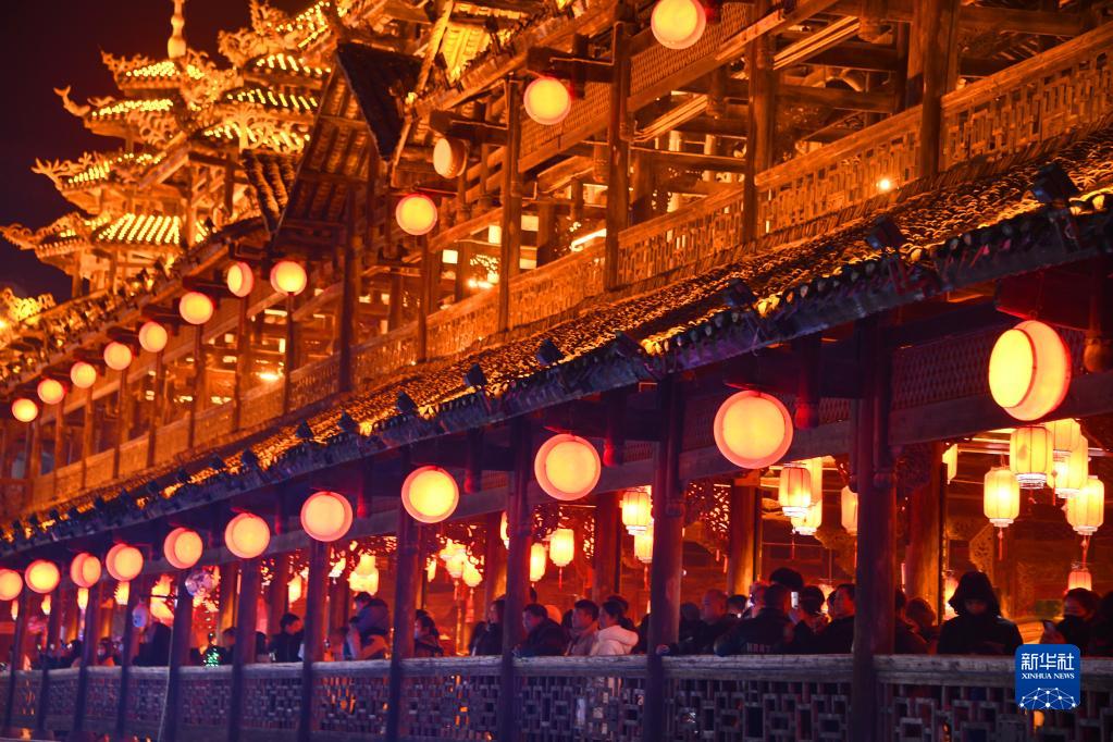 1月28日,游客在宣恩縣仙山貢水旅游區風雨橋游玩。
