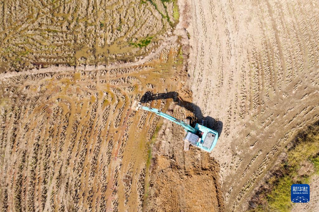 1月29日,在江西省撫州市金溪縣秀谷鎮五里村高標準農田建設現場,施工人員開動機械設備建設高標準農田。