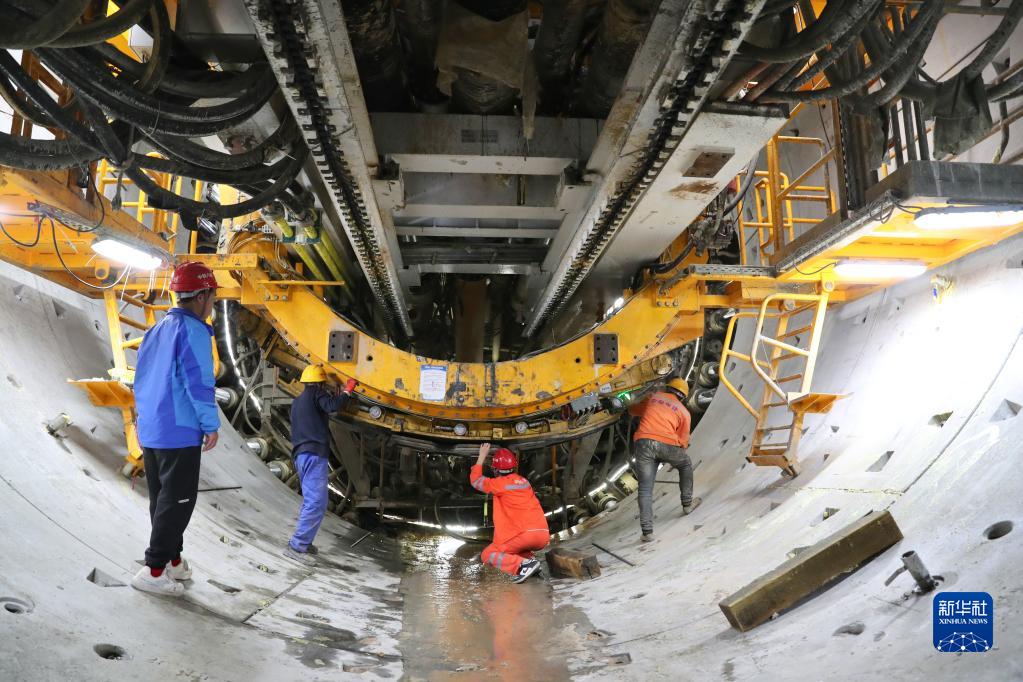 在福州地鐵濱海快線南公園站至三叉街站掘進區間,中鐵八局建設者檢查盾構機(1月29日攝)。目前福州地鐵濱海快線全線車站已動工,10個車站主體結構已封頂,19臺盾構機正在掘進。