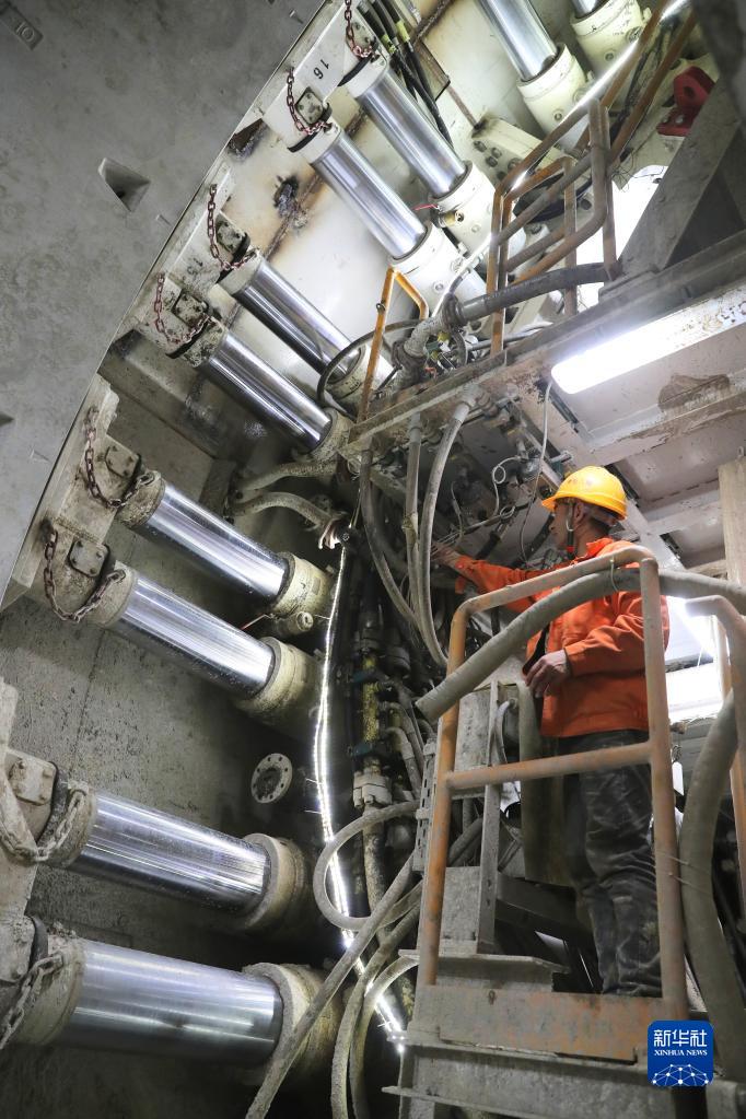 在福州地鐵濱海快線南公園站至三叉街站掘進區間,中鐵八局建設者檢查盾構機(1月29日攝)。目前福州地鐵濱海快線全線車站已動工,10個車站主體結構已封頂,19臺盾構機正在掘進。
