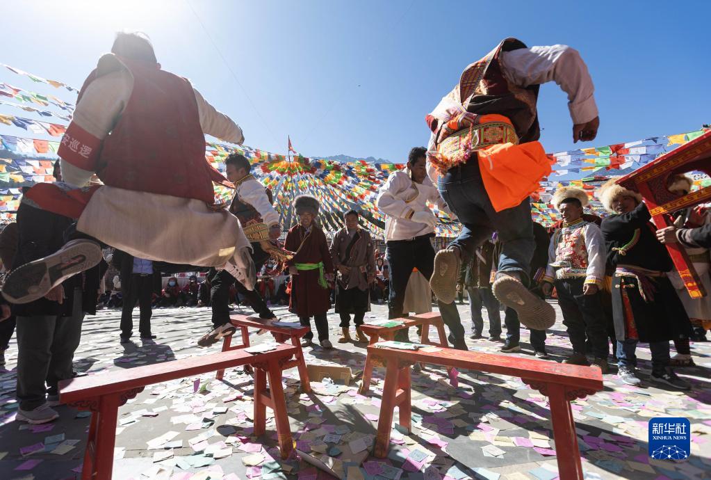 當(dāng)日,在夾金山山腳下,四川省雅安市寶興縣磽磧藏族鄉(xiāng)的藏族群眾身著盛裝,慶祝一年一度的“上九節(jié)”。近年來(lái),民俗旅游接待成為當(dāng)?shù)刂еa(chǎn)業(yè),“上九節(jié)”已成為當(dāng)?shù)赝平槊袼茁糜蔚囊粡堥W亮名片。