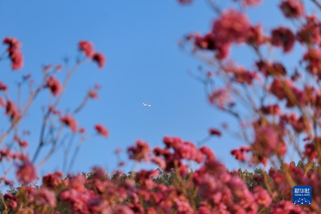 1月29日,在江門市新會區大澤鎮山頭坪,一架飛機在花海上空飛過。