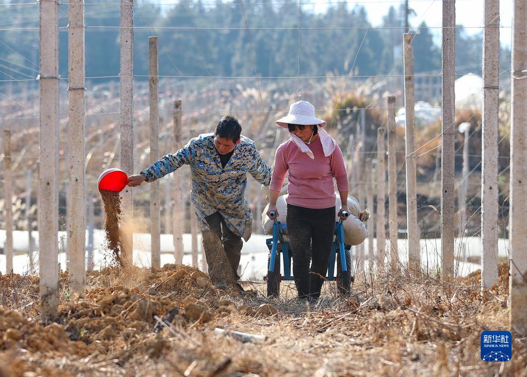 1月30日,貴州省黔東南苗族侗族自治州丹寨縣龍泉鎮馬鞍村村民在葡萄園里施肥。