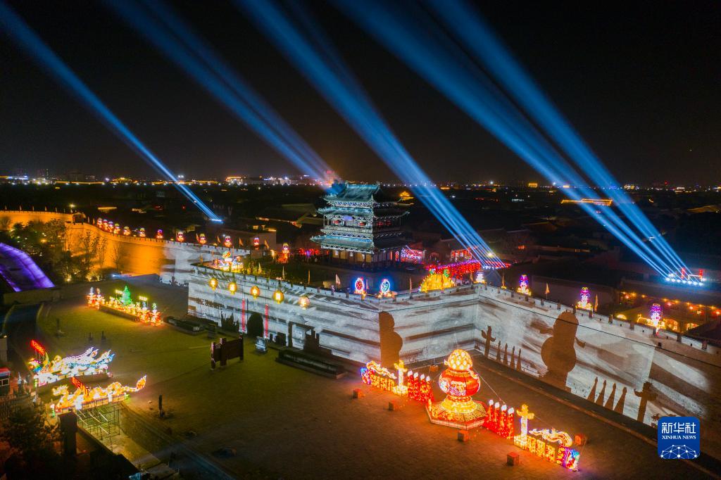 這是1月29日在山西省晉中市平遙古城拍攝的燈光秀(無人機照片)。