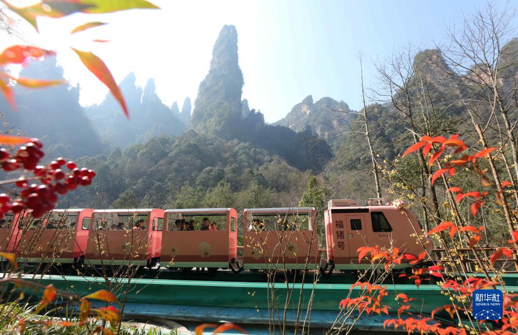 1月30日,游人乘十里畫廊觀光電車在湖南張家界國家森林公園游玩。