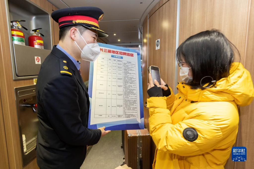 1月30日,在阜陽(yáng)開(kāi)往上海的G7445次列車上,鐵路上海客運(yùn)段乘務(wù)人員向旅客介紹長(zhǎng)三角務(wù)工招聘信息。