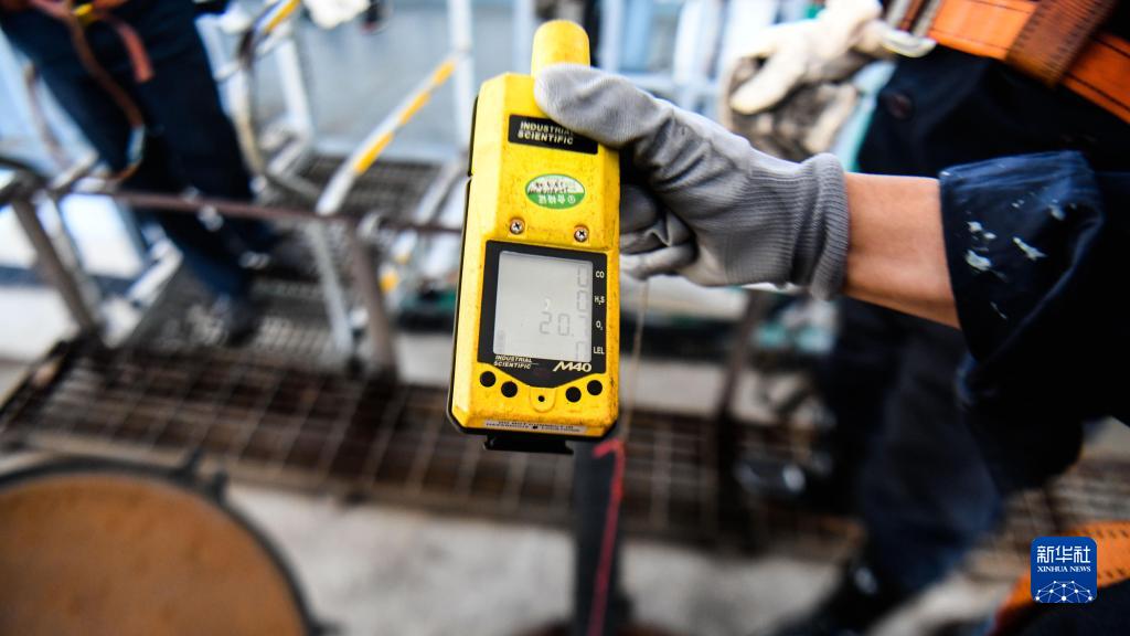 這是一名洗罐工對清洗后的油罐車內部進行環(huán)境測試(1月31日攝)。