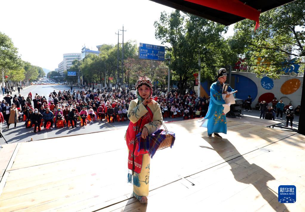 1月30日,在湖南省資興市人民廣場,演員在舞臺上進行花鼓戲表演。