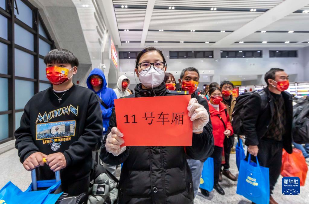 1月31日,務(wù)工人員在黔西高鐵站工作人員的引導(dǎo)下依次排隊候車。