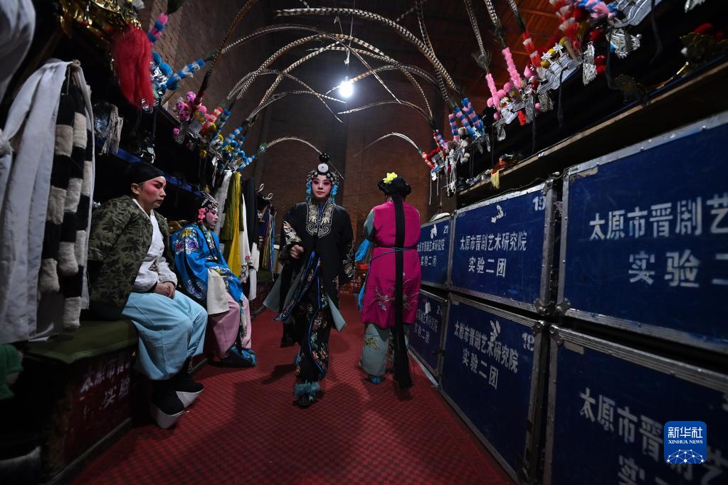 1月30日,在山西省太原市清徐縣孟封村,太原市晉劇藝術研究院實驗二團演員在后臺準備上場。