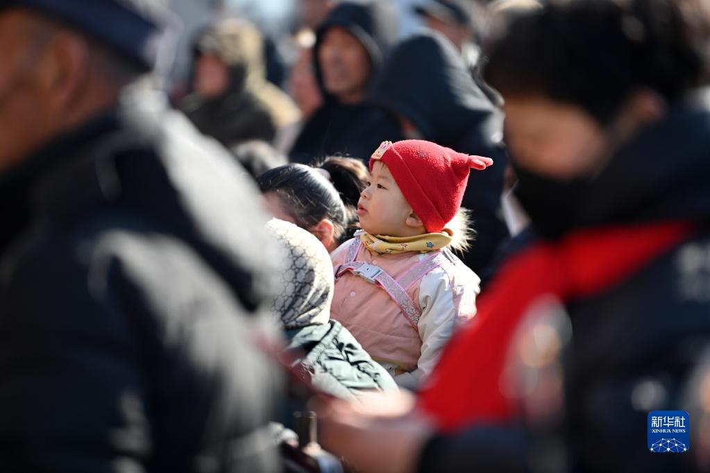 1月30日,在山西省太原市清徐縣孟封村,一名小朋友在觀看太原市晉劇藝術(shù)研究院實驗二團演員演出。