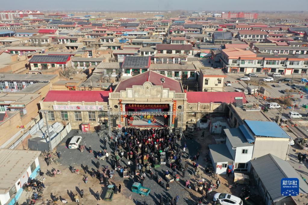 1月30日,太原市晉劇藝術(shù)研究院實(shí)驗(yàn)二團(tuán)演員在山西省太原市清徐縣孟封村演出(無(wú)人機(jī)照片)。