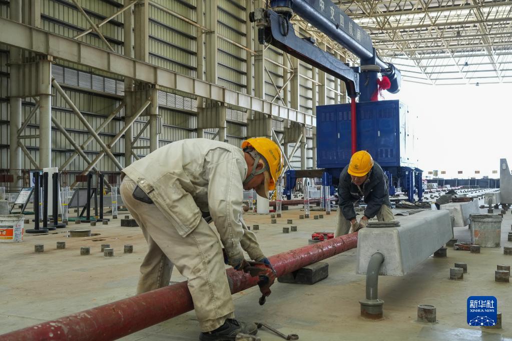 在中交四航局珠海牛頭島沉管智慧工廠,施工人員為深中通道海底隧道最后一個管節(jié)(非標準管節(jié)、含最終接頭)澆筑布置管線(1月31日攝)。