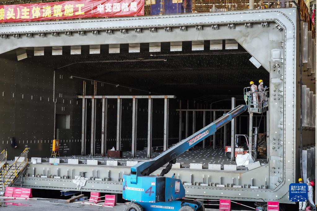 在中交四航局珠海牛頭島沉管智慧工廠,施工人員為深中通道海底隧道最后一個管節(jié)(非標準管節(jié)、含最終接頭)一次舾裝做準備工作(1月30日攝)。