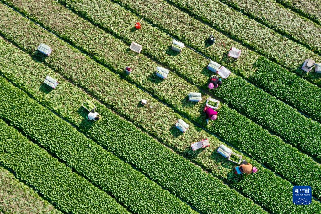 福州市閩侯縣南通鎮的菜農在采收蔬菜(1月30日攝,無人機照片)。