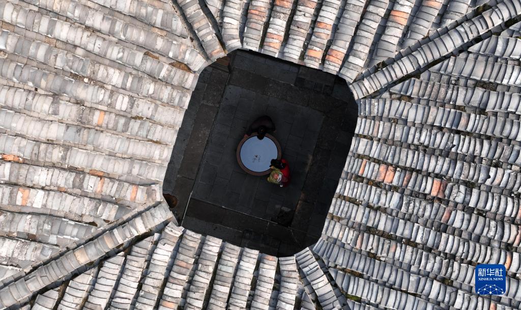 這是2月1日在舊州古鎮拍攝的一戶四合院的天井(無人機照片)。