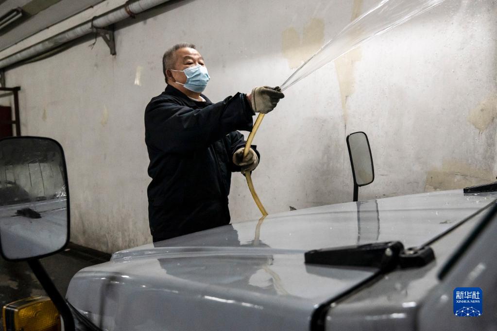 在南昌火車站,牽引車司機張細茂在清洗牽引車(2月1日攝)。
