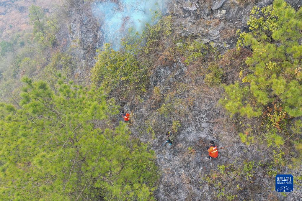 2月1日,滅火人員在都勻市墨沖鎮郊外山上撲火。
