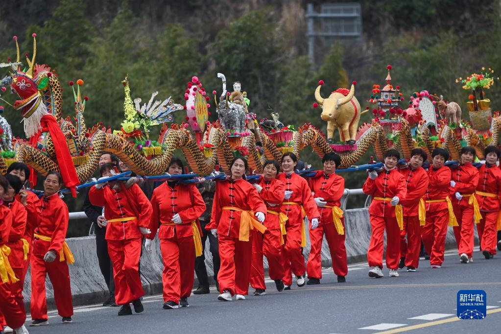 2月1日,窈口村女子板龍隊在湖源鄉(xiāng)走街串巷進行板龍舞龍表演。
